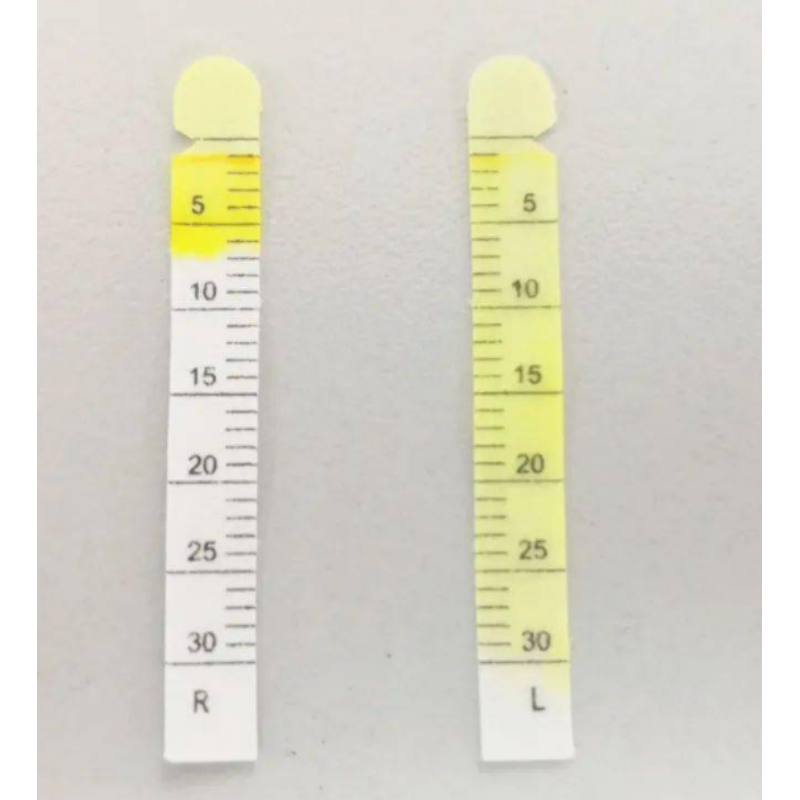 主要性能:泪液检测滤纸条应清洁、整齐、边无毛刺。滤纸条预先标明左右眼(L、R)并带有毫米刻度线,前端带有荧光素钠标识线,被泪液浸湿后有明显界限,可直接读数。标识线应线条清晰。