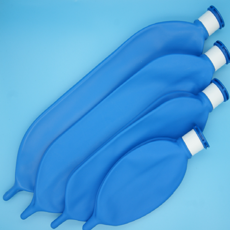 麻醉储气囊用于麻醉手术时,进行呼吸循环,是呼吸麻醉系统中用以贮气体的部件,用于调节供气量,当供气多于系统所需气体时,它将多余的气体暂时储存起来,而当供气不足系统所需气体时,它又将储存的气体释放出来给予补充,依据规格从小到大适用于幼儿、儿童及成人。