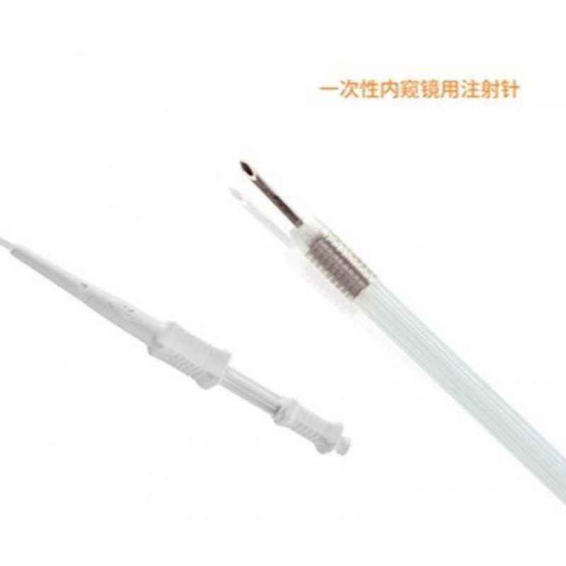 一次性内镜用注射针由金属针头、金属保护鞘、注射针内管、注射针外管、护套管、注液前手柄、注液手柄组成,注液手柄包含手柄连接器和注液口,有不同规格的金属针头,并提供多种针头的伸出长度和外管长度,作用于不同部位。