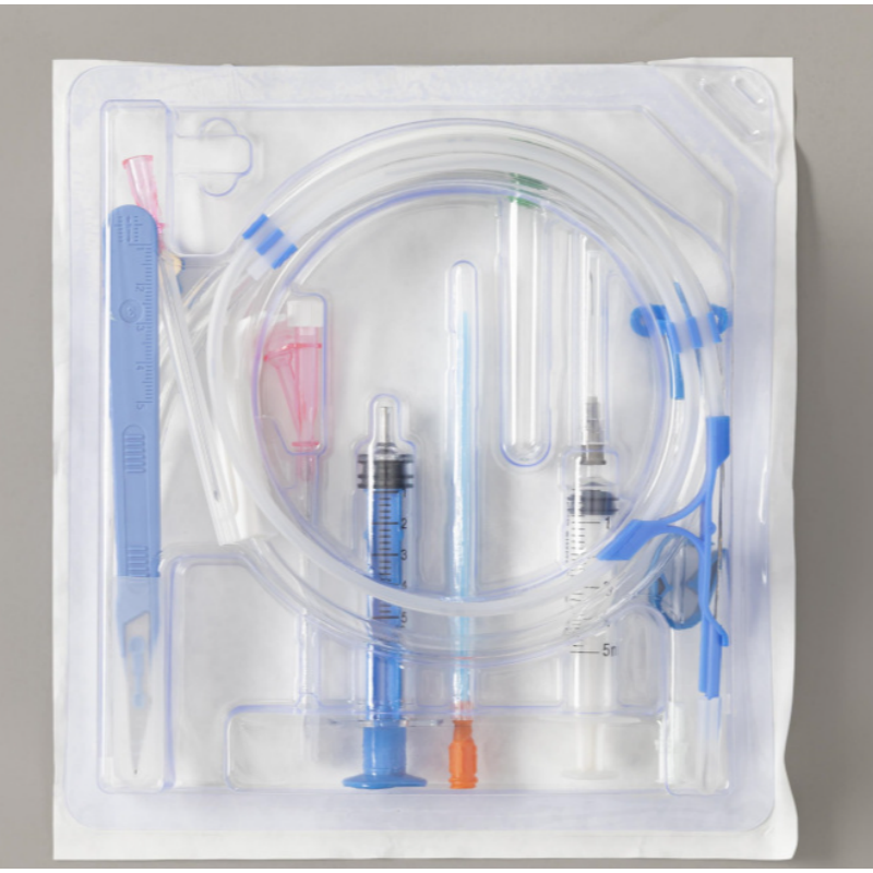 一次性使用胸腔引流导管套件由基本配置和选用配置组成。 其基本配置有胸腔 引流导管、导丝、扩张器、胸积液穿刺针。 选用配置器械有:一次性使用无菌 孔巾、中单、引流连接管、蝴蝶夹、消毒刷。 胸腔引流导管管体、连接座采用 穿刺针针座采用聚碳酸酯制成,针管采用304不锈钢制成。